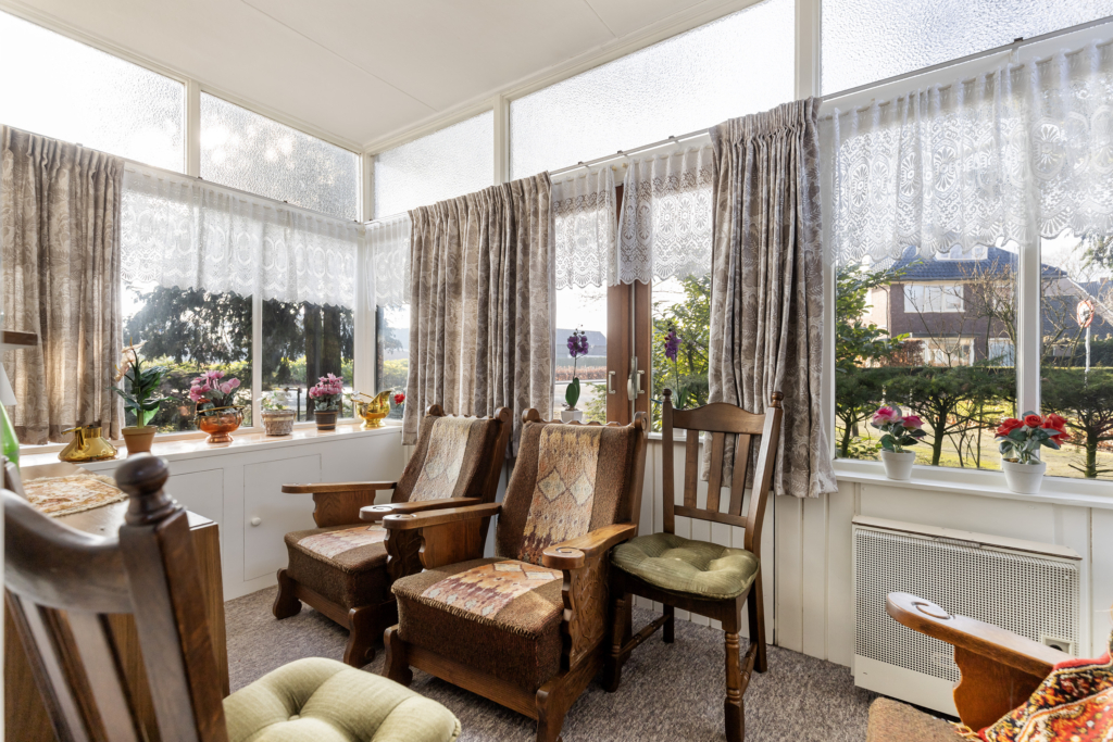 eveneens als slaapkamer gebruikt kan worden) kom je in de serre met dubbele terrasdeuren. De separate keuken is van een eenvoudig keukenblok voorzien. Vanuit de keuken via het achterportaal bereik je