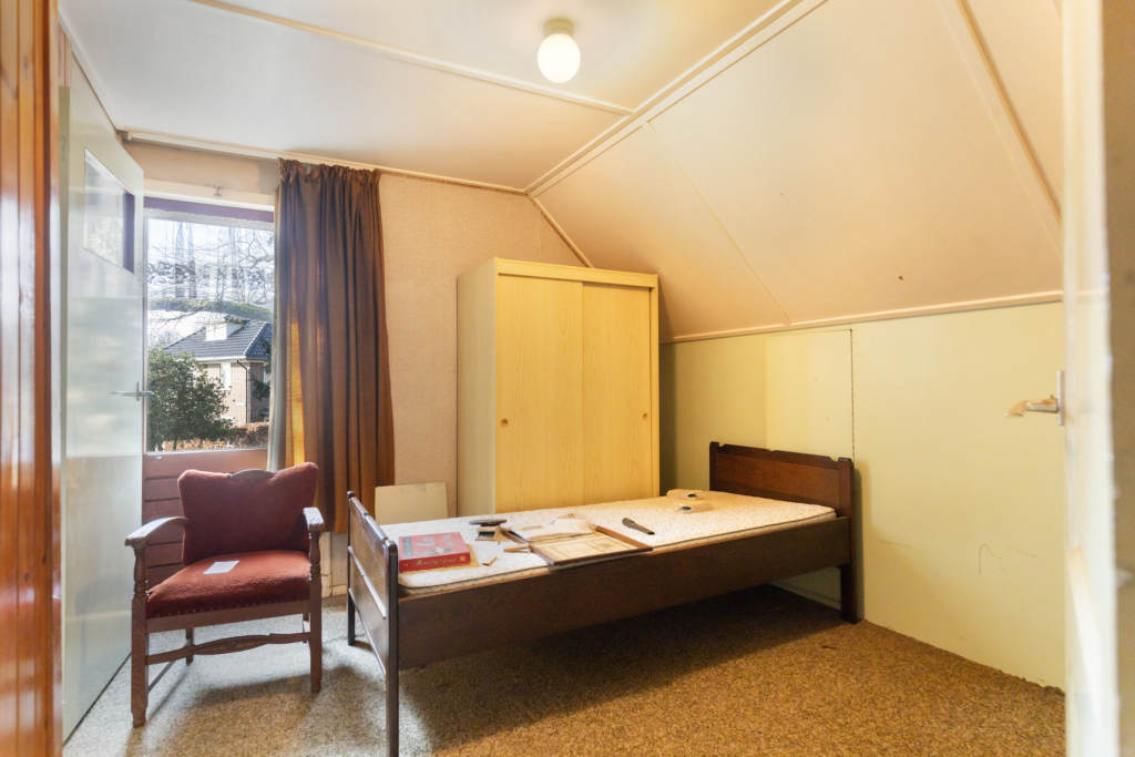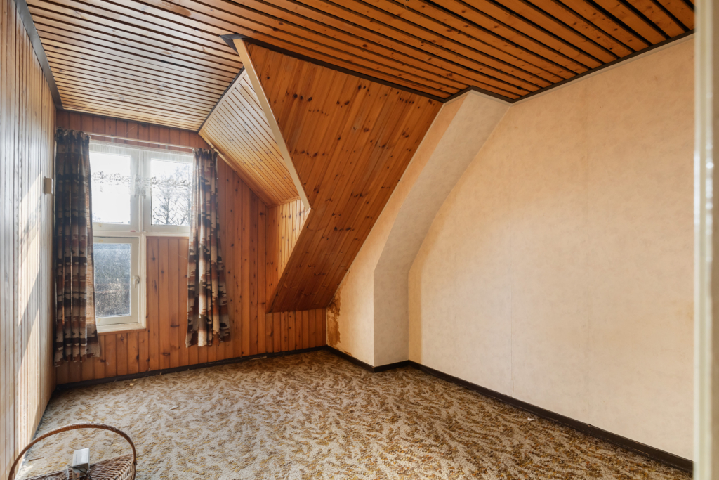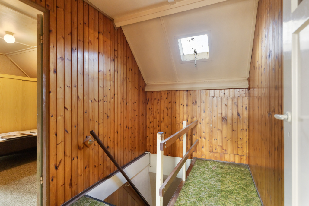 1e etage: overloop, 3 slaapkamers en bergruimte achter het knieschot.