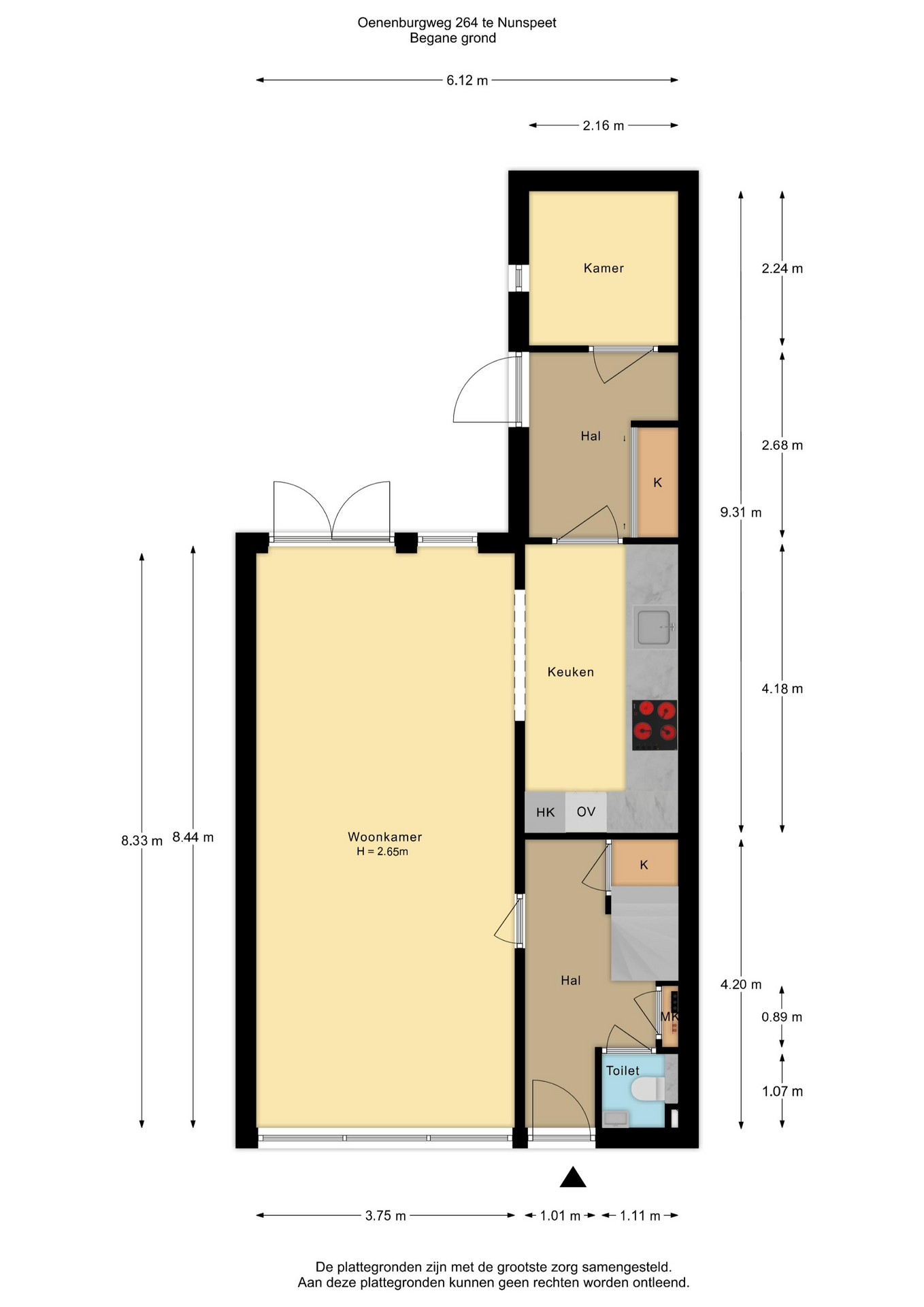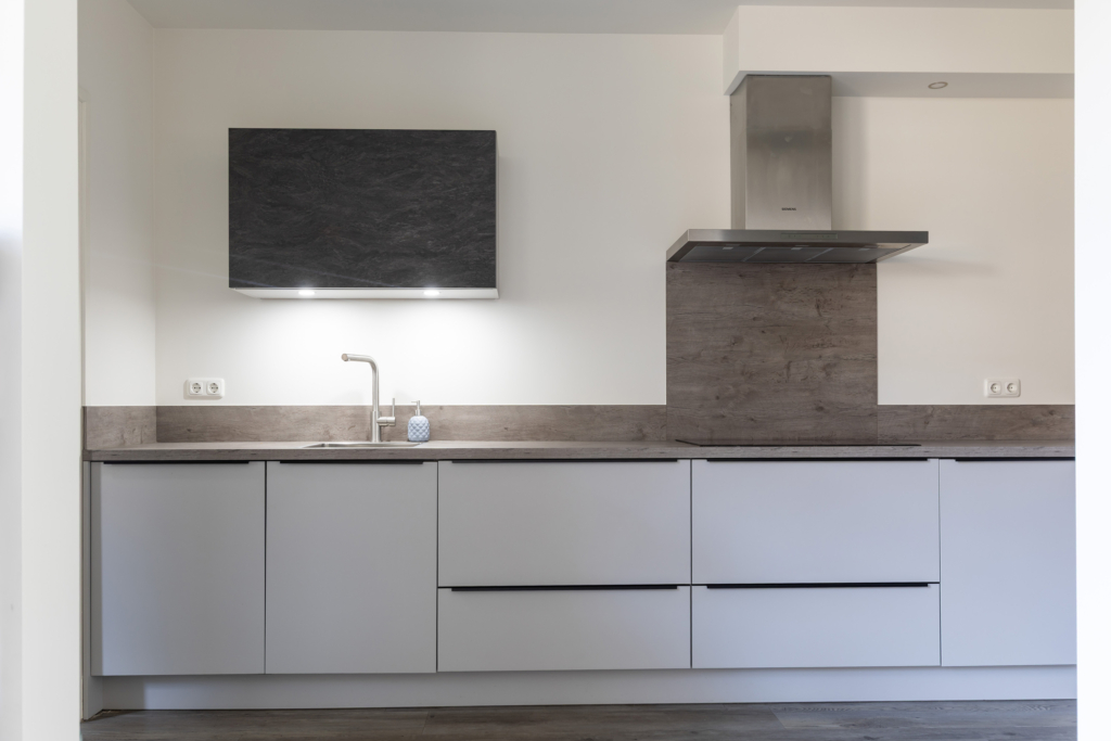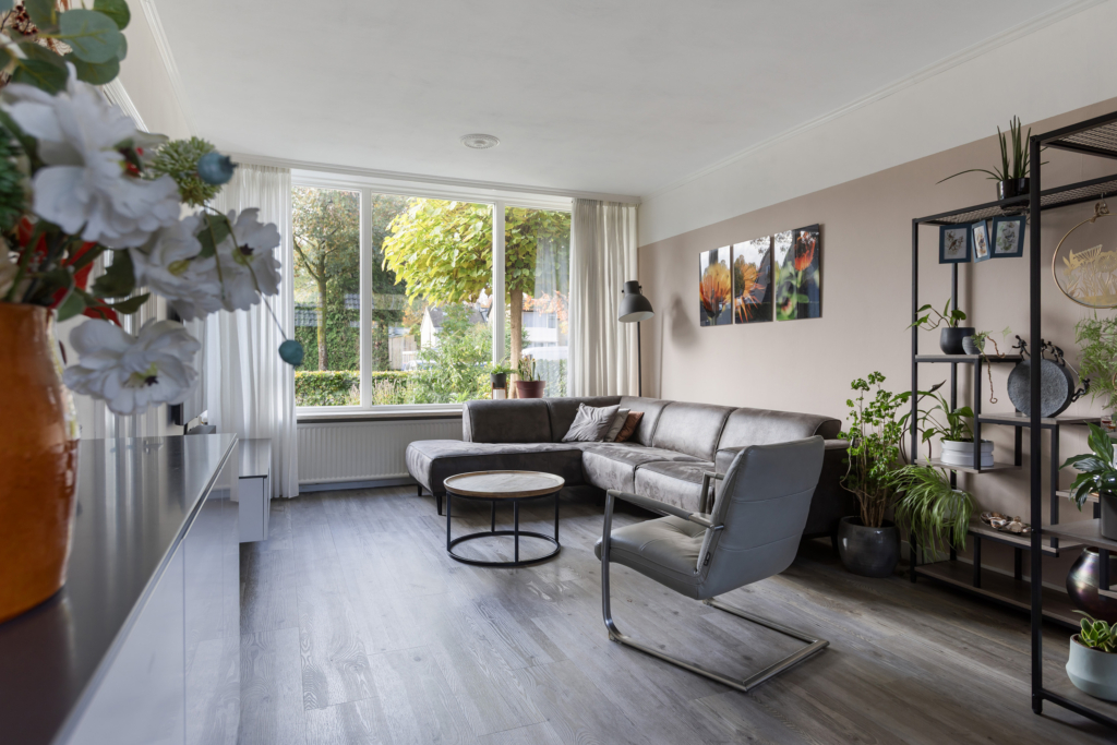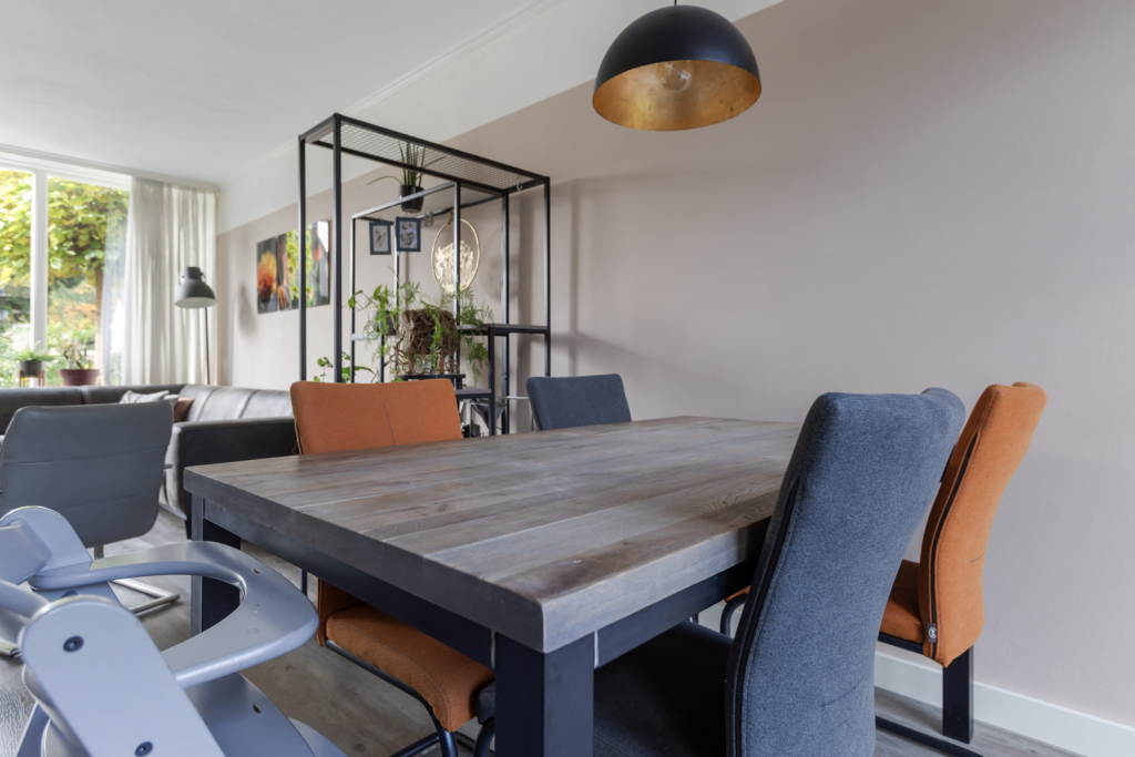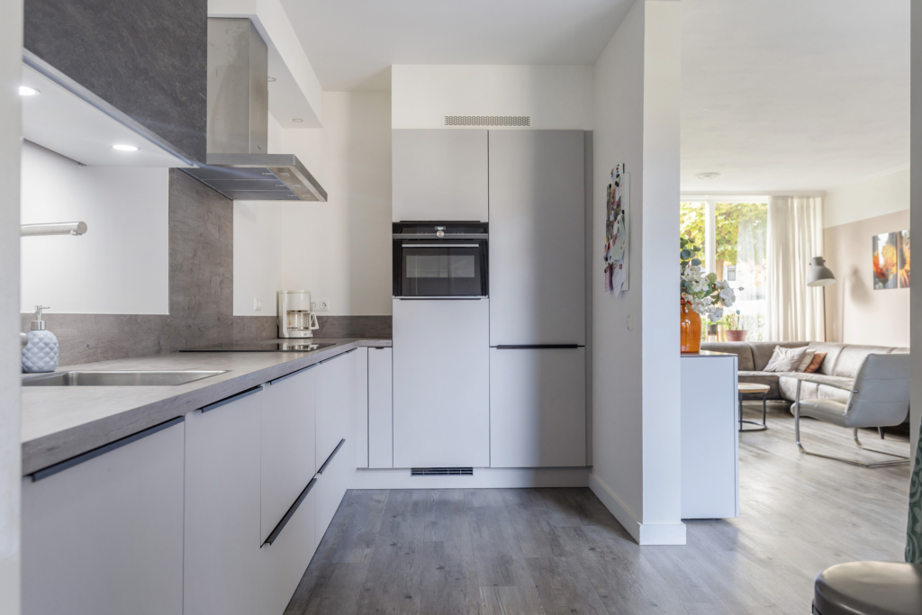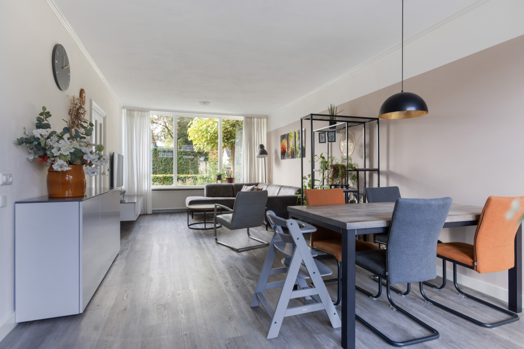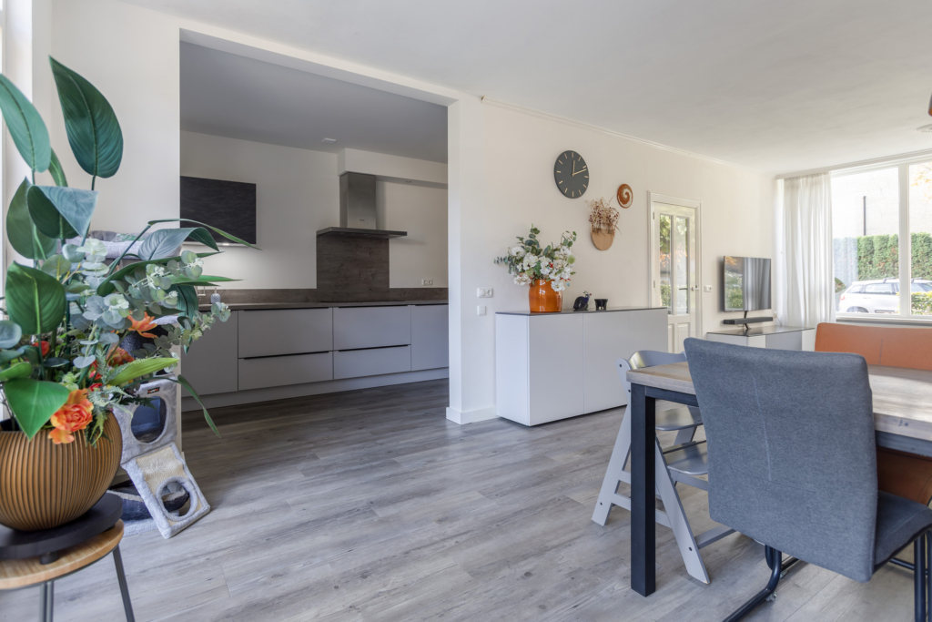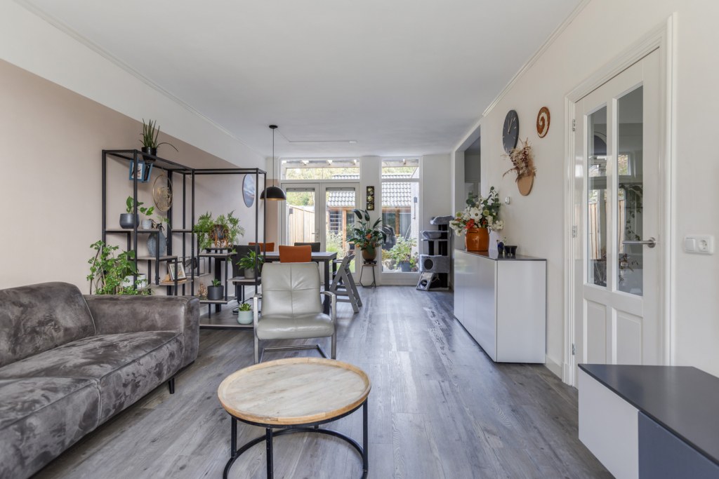 Via de hal met gerenoveerd toilet en meterkast kom je in de ruime woonkamer met veel lichtinval en dubbele terrasdeuren aan achterzijde. Door het verwijderen van een tussenwand biedt de half-open keuken met voormelde keukenopstelling veel ruimte.