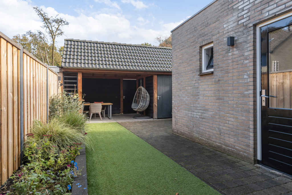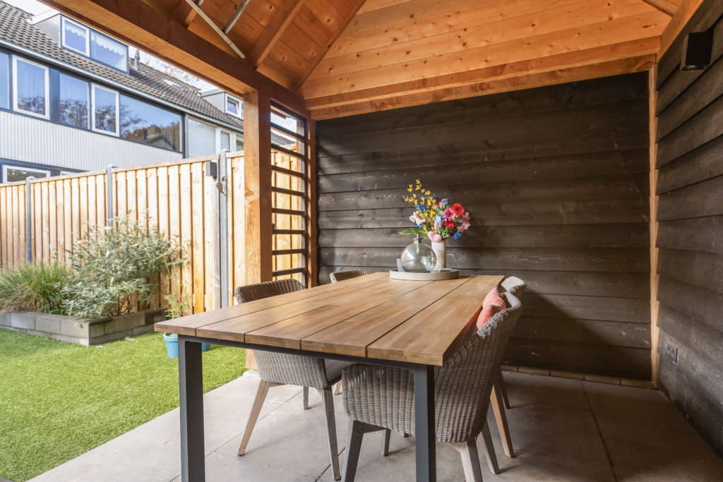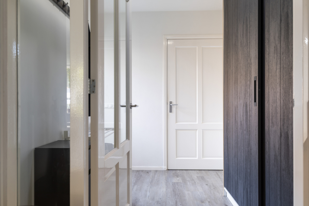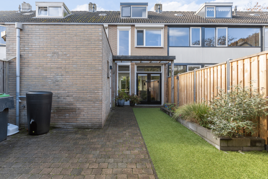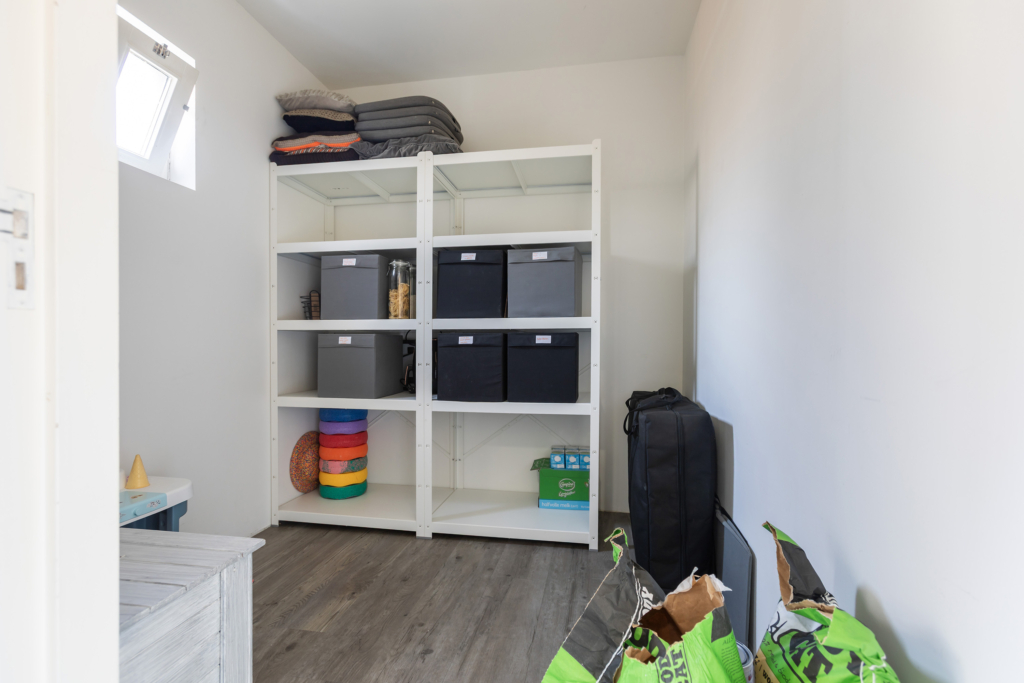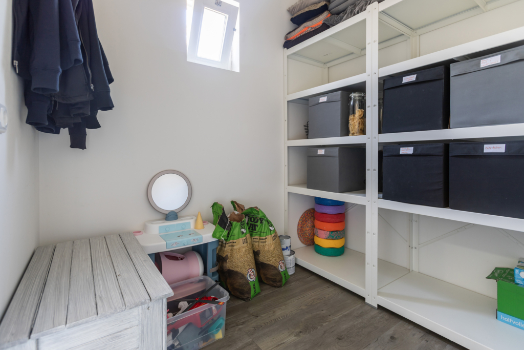 Vanuit de keuken bereik je de achter-entree met schuifkasten. Vanuit deze ruimte heb je toegang tot de achtertuin én tot de achtergelegen bijkeuken/opslagruimte. Deze ruimte kan uitstekend dienst doen als hobby-/werkkamer.