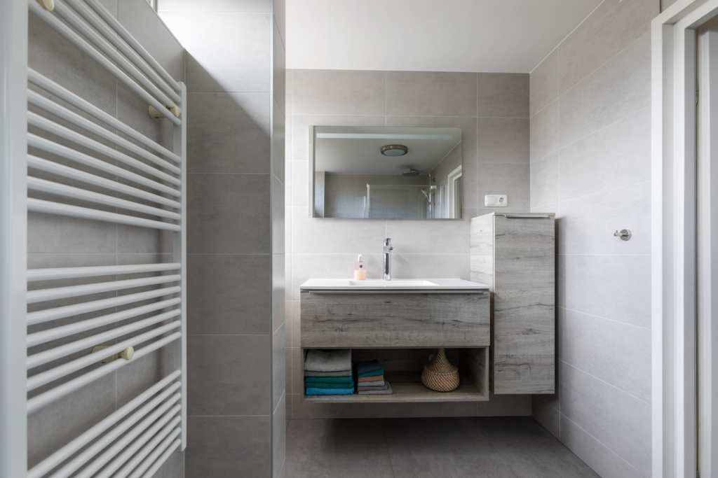 normen in een fraaie kleurstelling met een doucheruimte, wastafel met badkamermeubel, tweede toilet (wandcloset) en design-radiator.