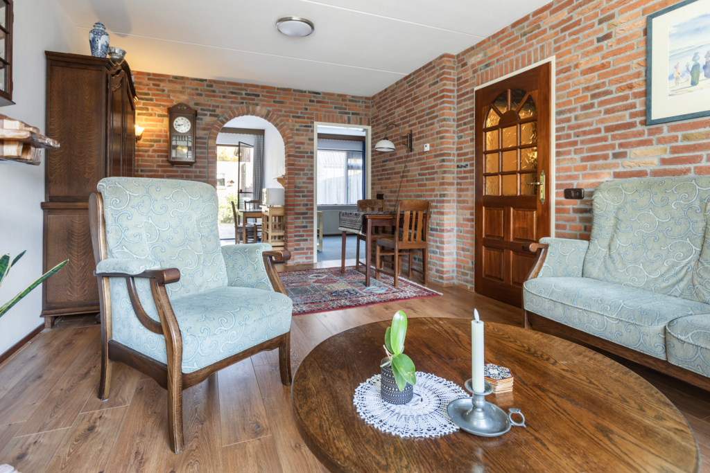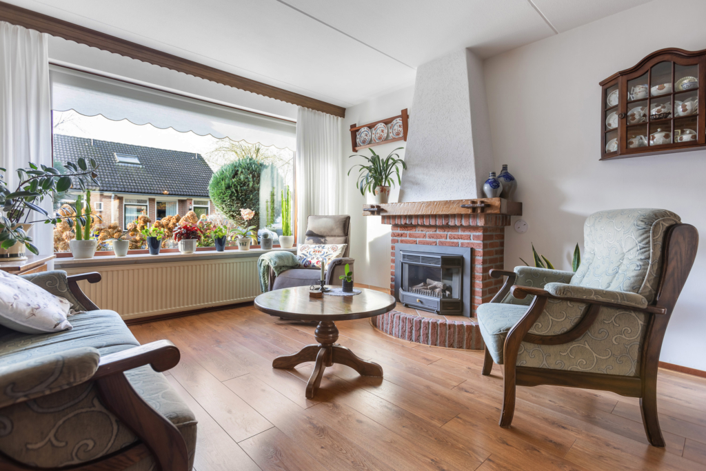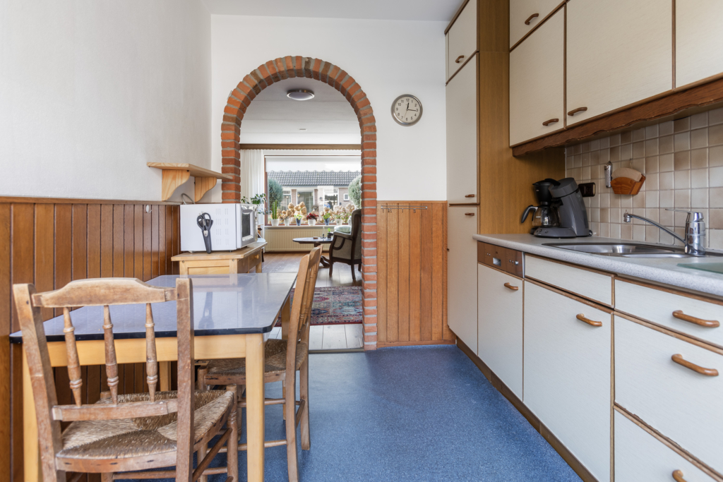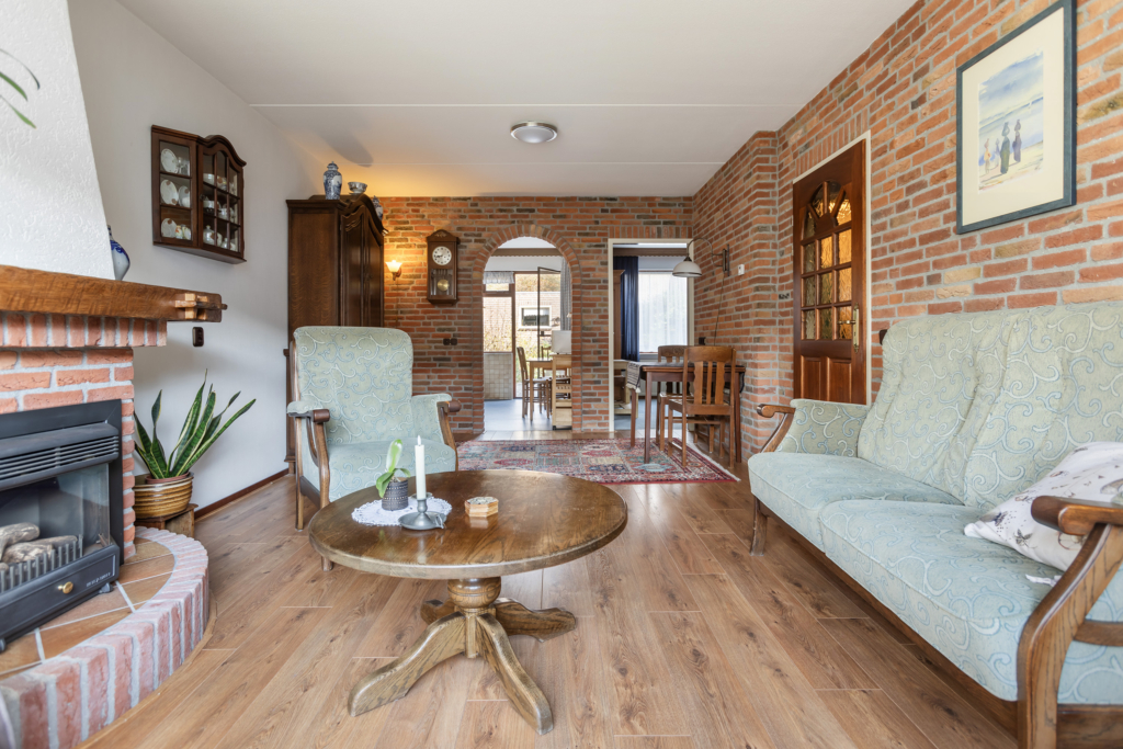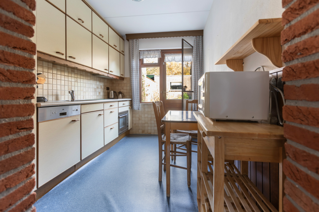 Indeling: hal met toilet en trapkast. Woonkamer aan voorzijde voorzien van schouw met gashaard. Via een toog naar de keuken welke van een keukenopstelling met inbouwapparatuur is voorzien. Vanuit de woonkamer bereikt u