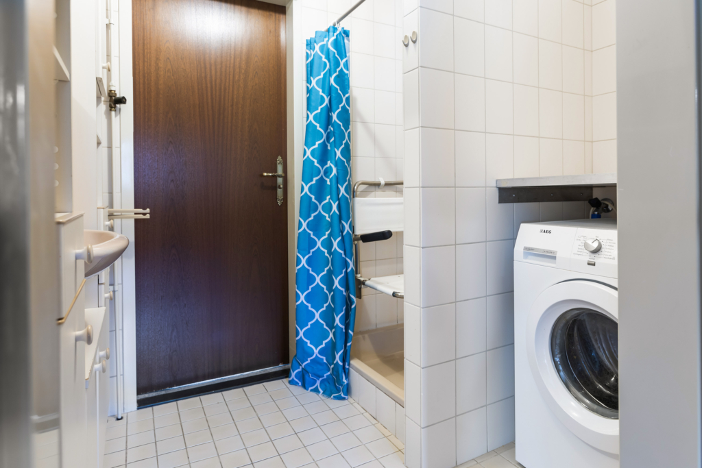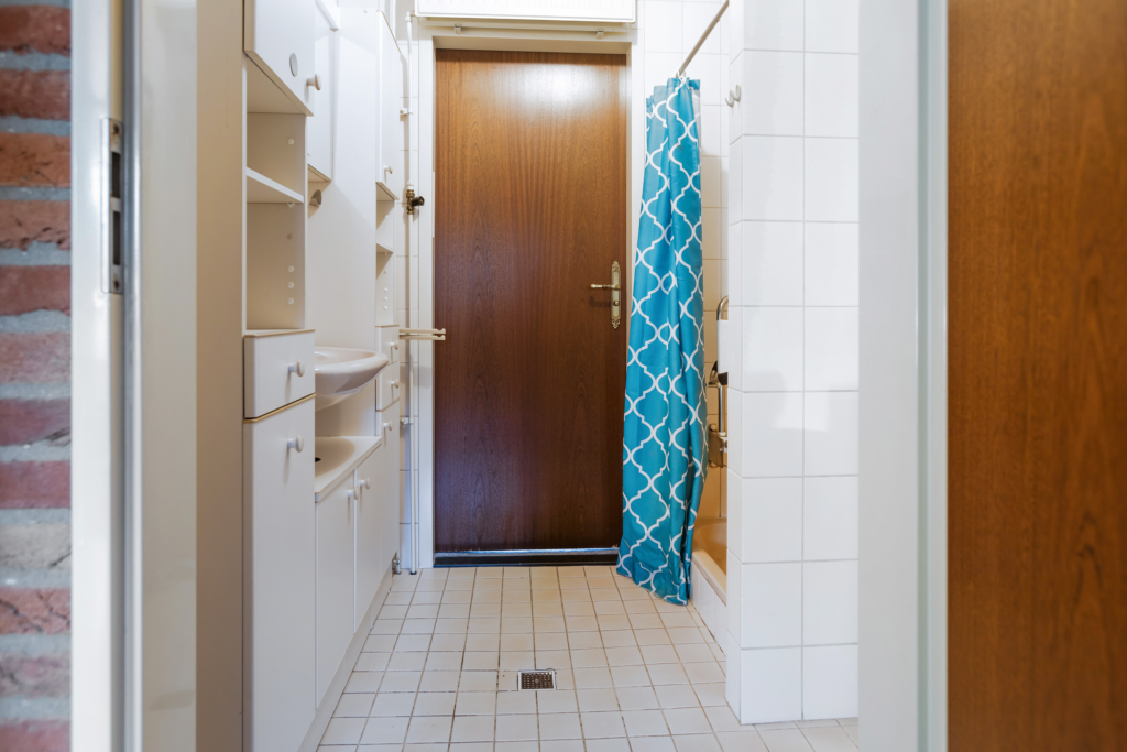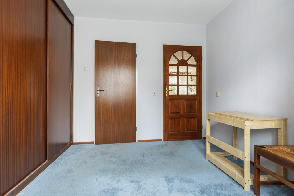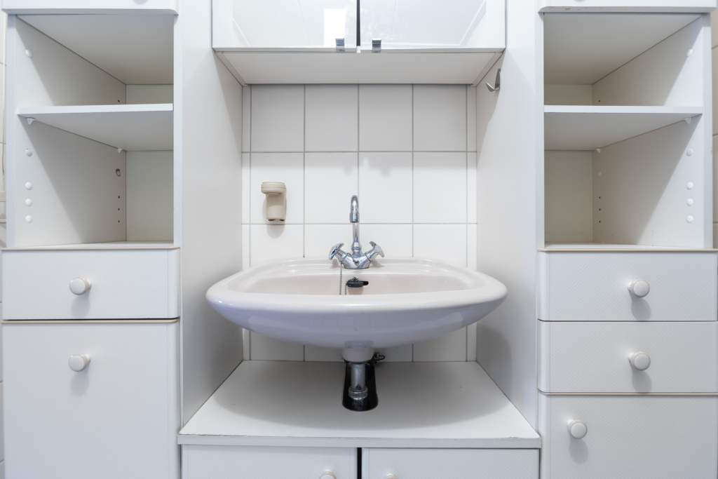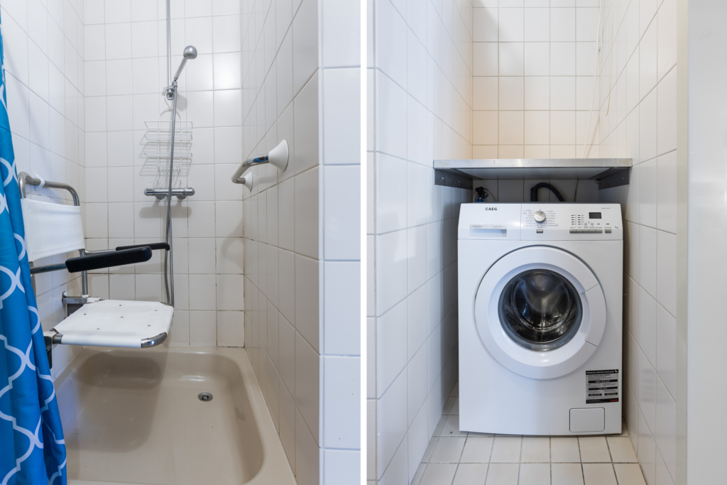 de aan achterzijde gelegen slaapkamer (ca. 3,37 x 3,40 meter) met schuifkastenwand en toegang tot de badkamer. Deze beschikt over een doucheruimte, wastafel en aansluitmogelijkheid voor uw wasmachine. De badkamer is