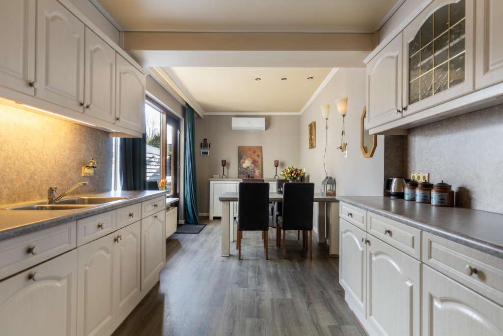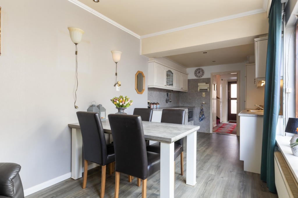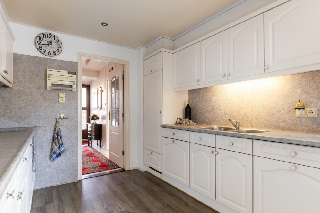 Door de uitbouw aan de achtergevel is een royale woonkeuken met een tweezijdige keukenopstelling en veel ruimte voor het plaatsen van een eethoek.