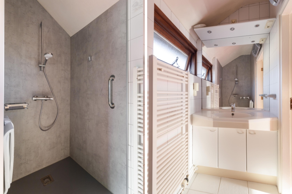 De nette badkamer voorziet in een doucheruimte, badkamermeubel met wastafel en een design-radiator.